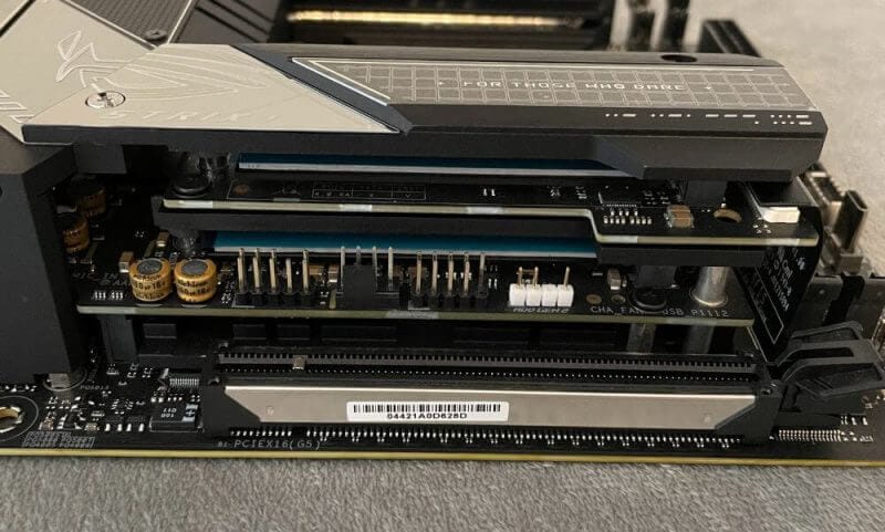 You’ll find the front panel speaker cable on the M.2 heatsink stack. Then, there’s one 2-pin power button header on the primary PCB to use the board without a riser card. This is if you don’t really need the additional paraphernalia.