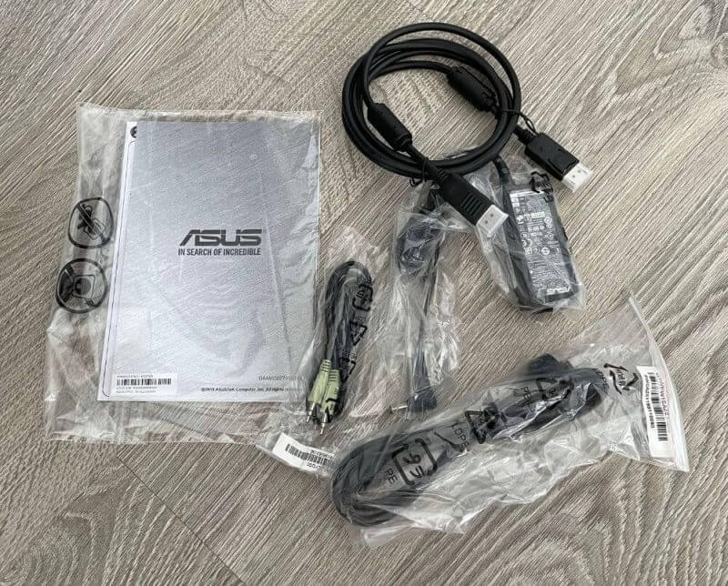 All the necessary accessories that are required to utilise the monitor are located on top. We get a power adapter, a power cord, a DisplayPort cable, a DVI-I Dual Link cable, a 3.5 mm to 3.5 mm jack, and an HDMI cable.