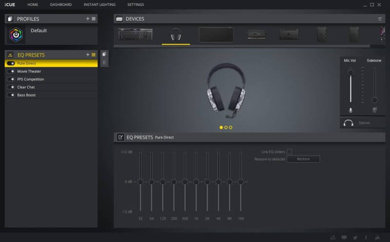 The Corsair HS60 Haptic Headset works with the Corsair iCUE software. This allows you to customise the equaliser on the headset and offers preset audio features.
