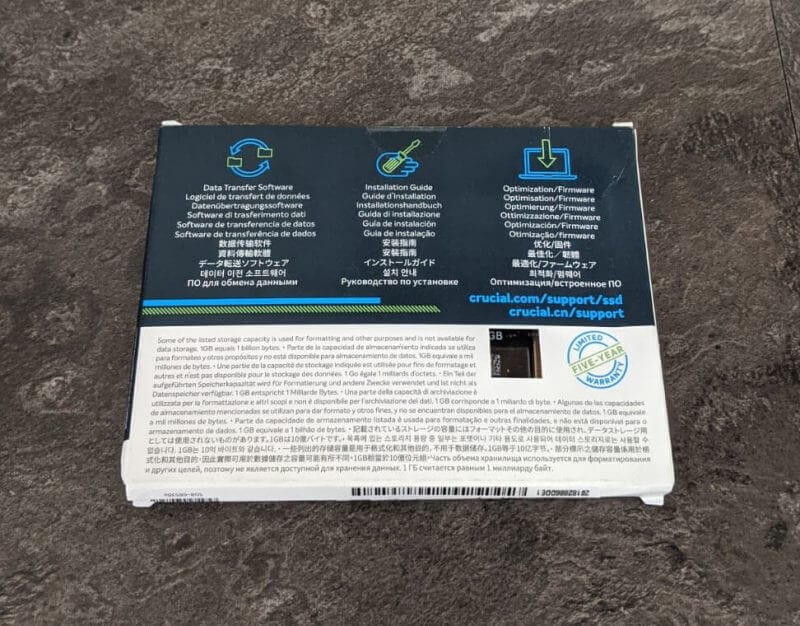 However, the design isn’t entirely necessary, as long as the item is safe inside. The Crucial Logo is on the upper-left portion of the box, and the lower-left side indicates the capacity.