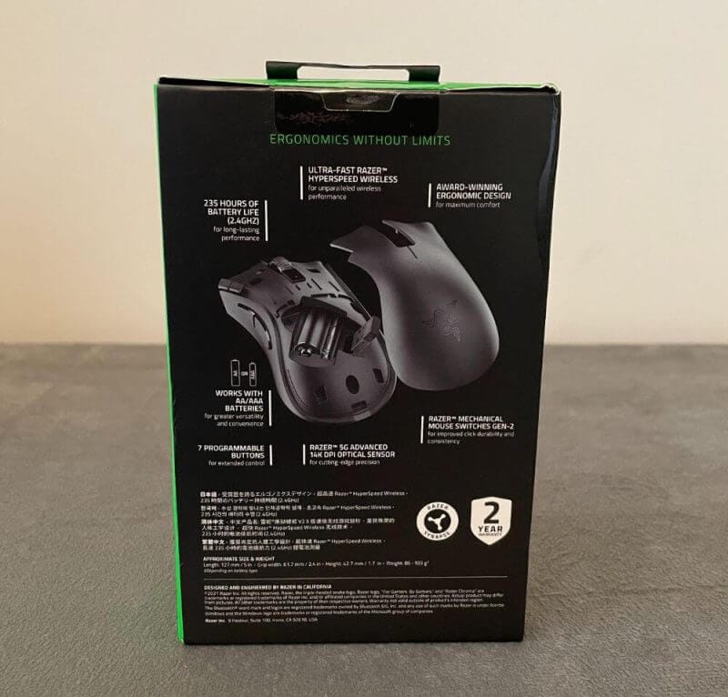The mouse arrived in a standard-looking Razer package that sports a black and green theme. The front displays an image of the mouse, its name, plus its main features.