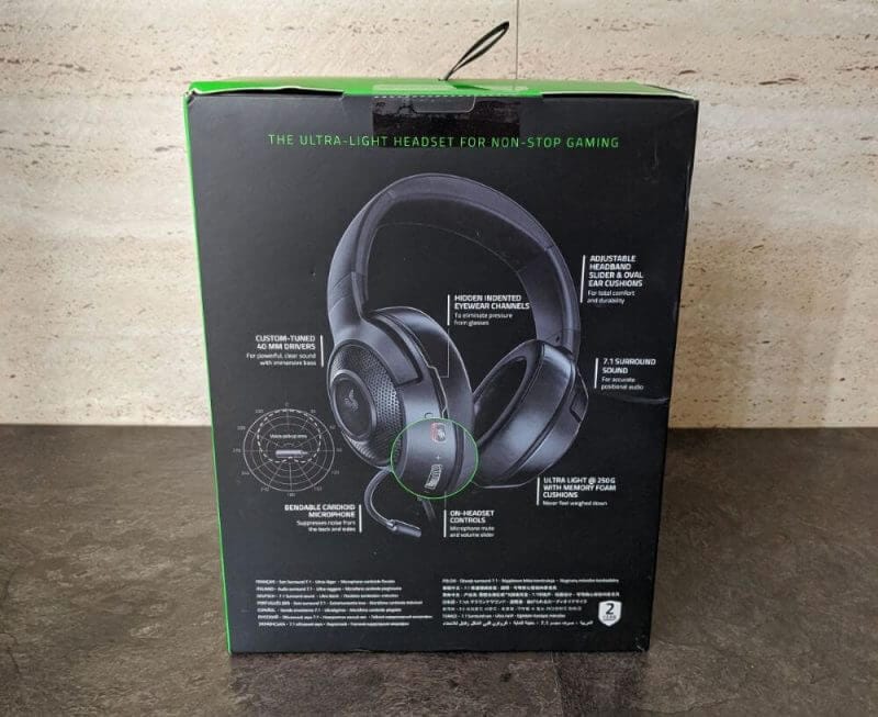 At the front of the box, the Razer logo is shown on the top right. There is also a sample of how the headset looks like, along with the features that it supports.
